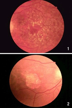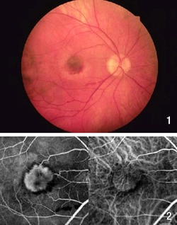 3. Farbstoffuntersuchungen (Fluoreszenzangiographie): Dabei werden nach Injektion eines Farbstoffes in eine Armvene abnormale Gefäße im Augenhintergrund fotografisch dargestellt. Dies ist wichtig als Grundlage für die Empfehlung einer Therapie, falls sie in Frage kommt.