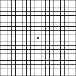 Das Amsler-Netz ist eine Testfigur, um die Funktion der Makula zu testen. Wenn Sie den Punkt in der Mitte der Figur fixieren, erscheinen die Linien am Rande Ihrer Augen unschärfer; das ist normal. Verbiegungen der Linien und Verzerrungen der Quadrate jedoch sind Hinweise auf krankhafte Veränderungen der Netzhaut.
