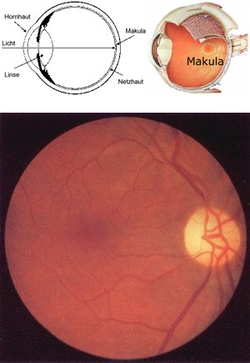 Die Makula - auch "gelber Fleck" genannt - stellt ein kleines hochspezialisiertes Areal auf dem Fotofilm des Auges, der Netzhaut, in der Mitte des Augenhintergrunds dar (Abb. 1 und 2). Dieser nur wenige Quadratmillimeter große Fleck ist für wesentliche Sehleistungen verantwortlich: Lesen, Erkennen von Gesichtern und feinen Einzelheiten, Unterscheiden von Farben. Die ganze übrige Netzhaut nimmt hauptsächlich nur Umrisse und Hell-Dunkel-Kontraste wahr. In der Makula herrscht ein reger Stoffwechsel, dessen Abbauprodukte von der darunter liegenden Gewebsschicht, dem so genannten Pigmentepithel, entsorgt werden. Mit dem Alter kann es dabei zu Störungen kommen, die zu Ablagerungen unter der Netzhaut und zu weiteren Funktionseinbußen führen können. Dies bezeichnet man dann als "altersabhängige Makuladegeneration" oder kurz "AMD". Die Folge ist, dass man in der Mitte des Gesichtsfeldes verschwommen, verzerrt oder einen dunklen Fleck sieht. Da nur die Netzhautmitte, also die Makula, betroffen ist, bleibt das äußere Gesichtsfeld erhalten. Das bedeutet, dass Sie z.B. eine Uhr sehen, die Uhrzeit jedoch möglicherweise nicht erkennen können.